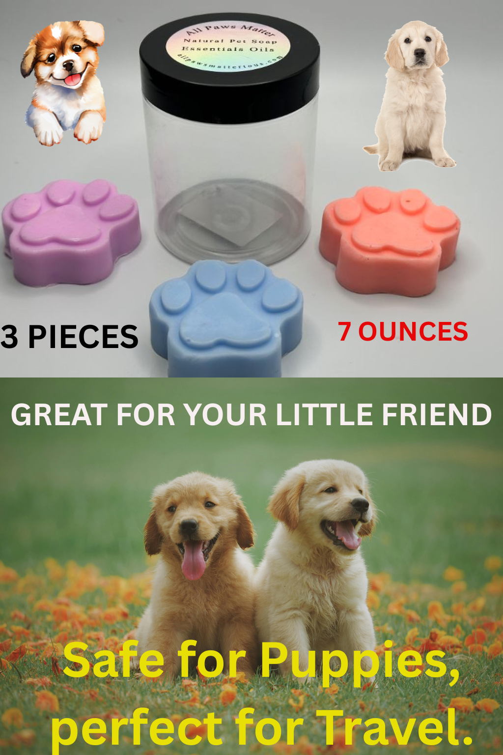 “Our all-natural Pet Soap is Handmade in USA, is specially formulated to effectively Fight FLEAS,TICKS & ALLERGIES,MOSQUITOES. Made with safe, ingredients, it protects your Pet from pests without harsh chemicals.”